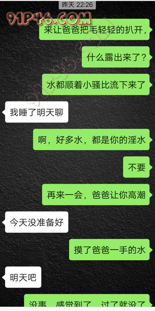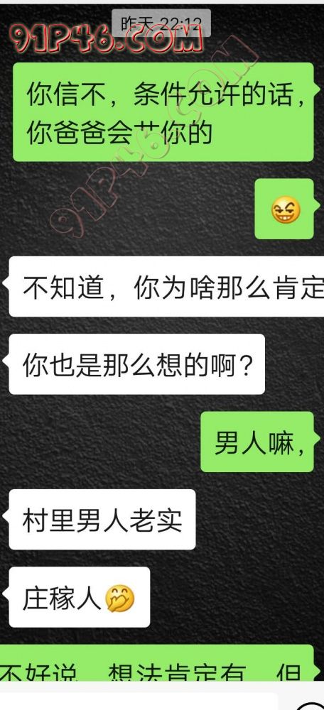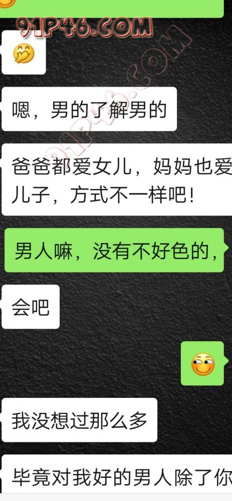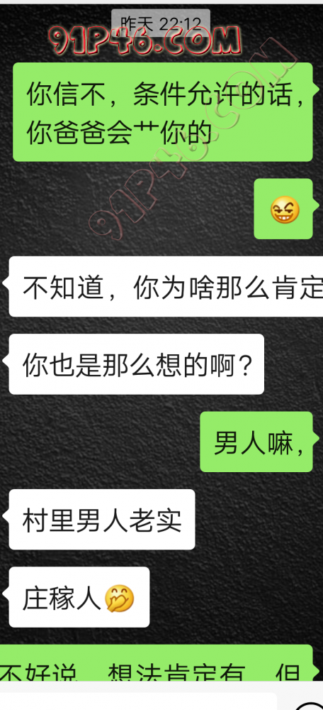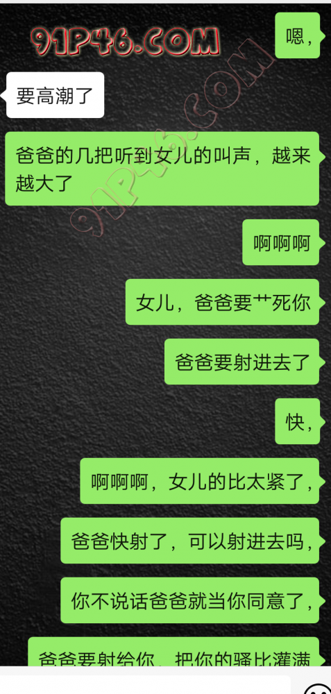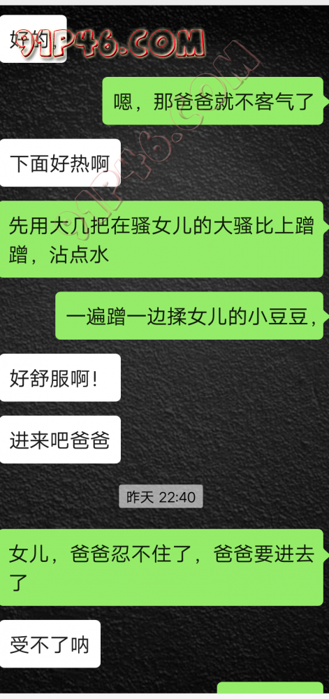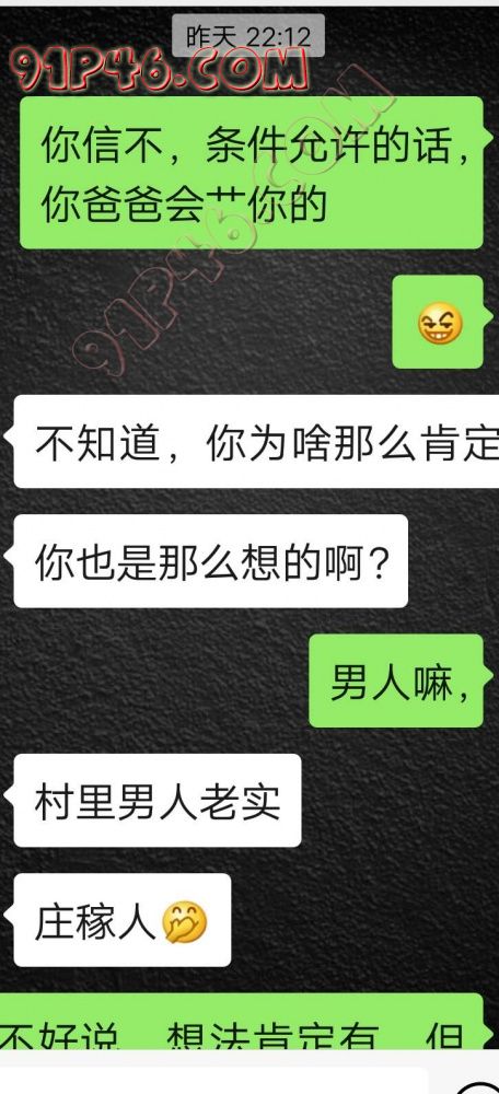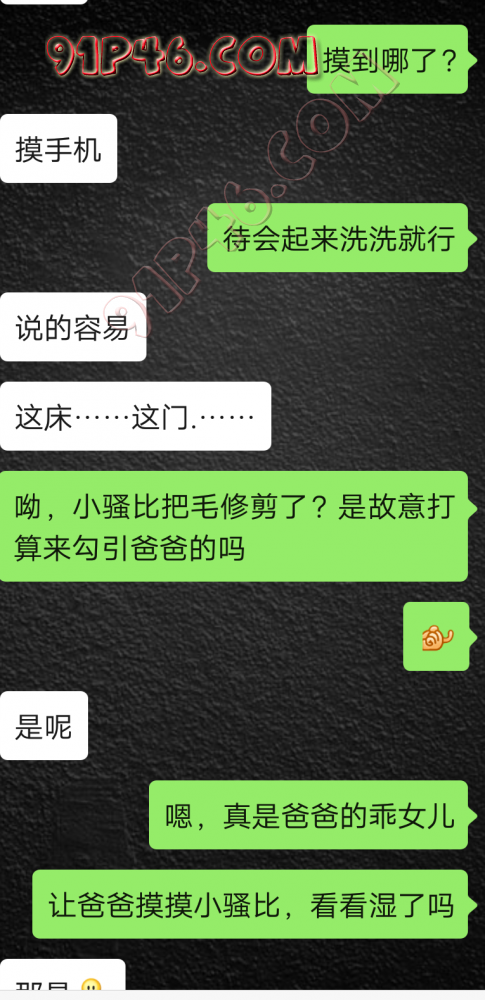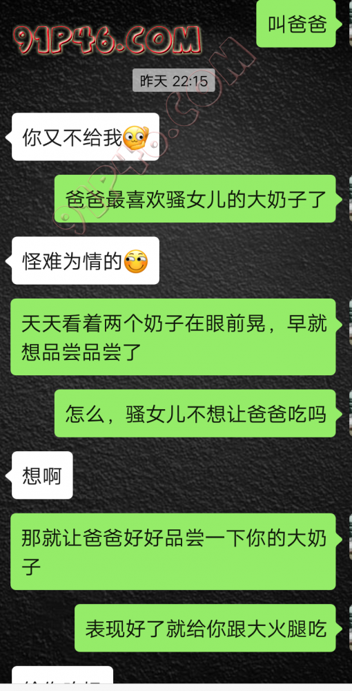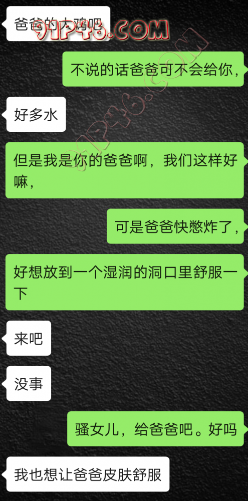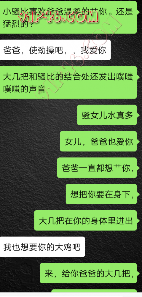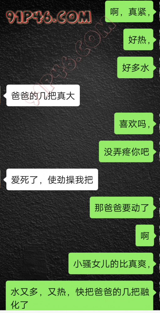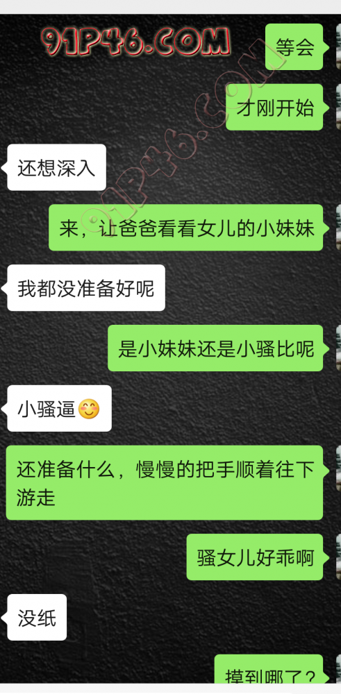 逛91也有几年了,发帖并不多,简单介绍下,男29.女27,颜值、身材、条件都一般,我的话顶多就是淫妻心理,不是绿帽!老婆其实并不太开放,更多的是迎合我,以及被我开发调教的结果,或许女人都有这个潜质吧,只是遇到合适的人了。我俩开始的挺意外的,就是玩玩的心态,想着都是同事,吃点豆腐,最好能来一炮,不怕笑话,我21的时候还是处男,老婆交往过两个,只和一个有过,毕竟我俩认识那会儿她才18,她当时有个异地的对象,但是感情不算稳定,然后稀里糊涂的就处上了,在一起住了一年多,家里就催着结婚了。提前得交代的一下是,我确实比较好色,还有点特殊癖好,所以玩的花样比较多,意外的是慢慢的发现她接受能力挺强,外出带跳单,家里玩玩具,情趣内衣,都是初期就接触的,后来她换了工作和同事合租,她们在2楼,我和未来小舅子在1楼,期间经常我去她宿舍留宿或者她下来在我的窝里过夜,值得一提的是2楼是一间屋里两个单人床,中间间隔有一米多点,什么格挡也没,楼下更是只有一个双层床,所以,当时那种激情场景不知道各位能否想象的到,压抑中,偷偷的嘿咻。可能也是她的这种配合和对我的纵容,才能让我对她一步一步的开发吧,再后来结婚回了老家发展,淫妻癖越发严重,换图、交网友.....怎么说呢,有一个爱我和配合我的女人,挺幸运的,但是人的心理永远不会满足。前段时间看论坛里几个大神的贴,就是勾引公公的,火的帖子好像得3个了吧,可惜啊,都太监了,不过倒是越来越引起我的淫妻欲了,虽然之前和老婆做的时候也会玩玩角色什么的,但今年却越来越沉迷当中,日常做的时候让她喊爸爸什么的也都能配合。最近把老婆送回老家了,顾及时在那边待的寂寞了,所以就有了下边的聊天内容,也就有了今天的帖子,先声明一下,自认为女儿和亲爹通奸的剧情不太容易在闲事里发生,所以也没过多的奢望能发展到什么样。好了,废话了这么多,各位看官来看聊天截图吧。 今天继续更