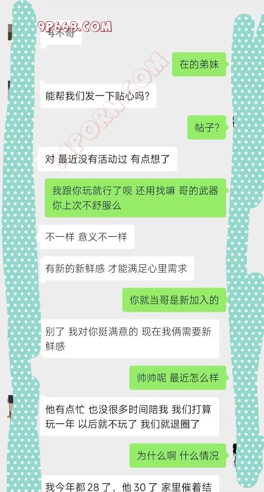大家可以先看看聊天记录,我记得第一次认识的时候直接给我口射了,爆了她一嘴,当时还挺不好意思的,我年龄大了,受不了,但是当晚还是干了她三次。还在一起开发三洞齐入,多人玩,尤其是开肛的时候,疼哭了,其实蛮心疼的,眼泪流出来心疼死了,那时候她也才25吧应该是,粉粉嫩嫩 白白的,真的玩的非常的爽,叫爸爸,有一个那个m表,太变态的就不算了,基本上都画上对号了,最后玩一年了,马上结婚了她,以后圈里就又消失了一对优秀的情侣。但是也不一定,就她这个瘾,有可能生过小孩也要出来玩。